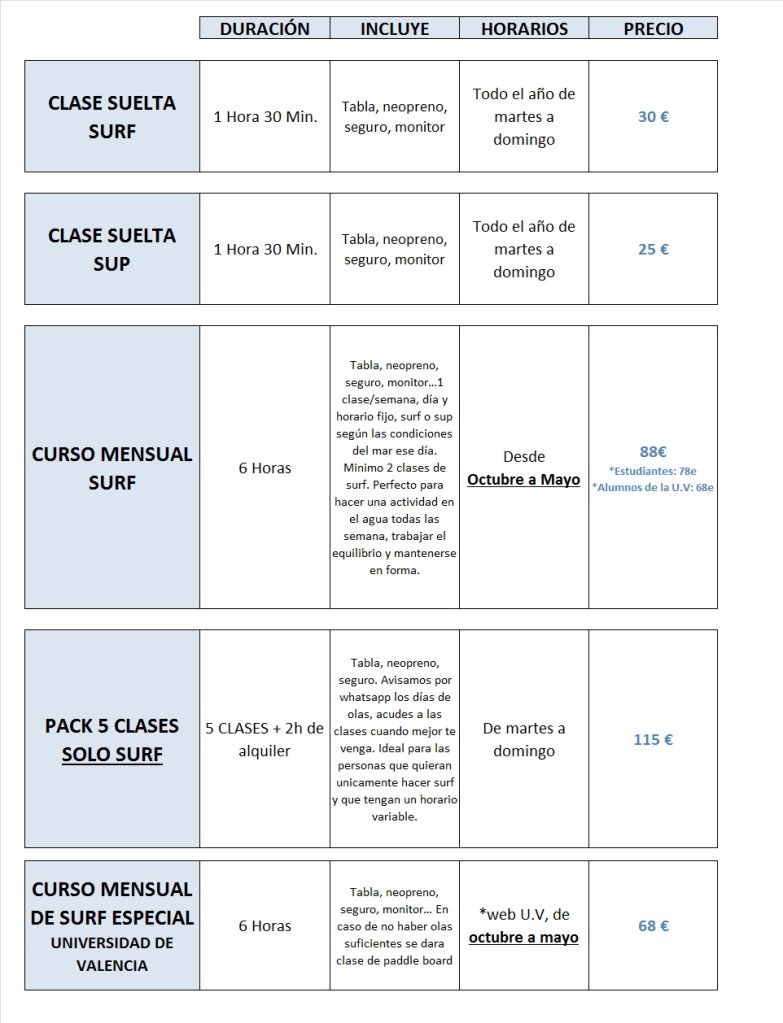 PACKS Y TARIFAS CLASES SURFKATE- SURF – SUP